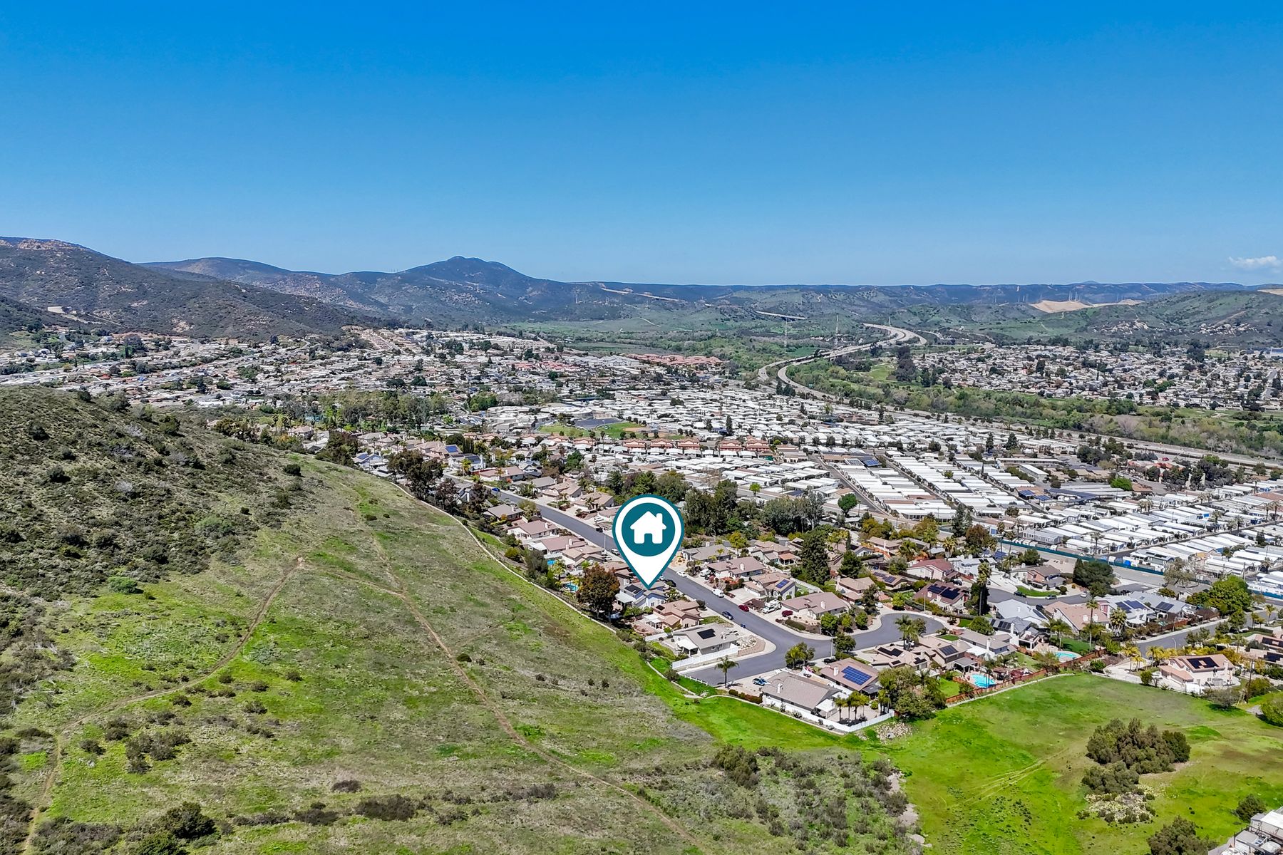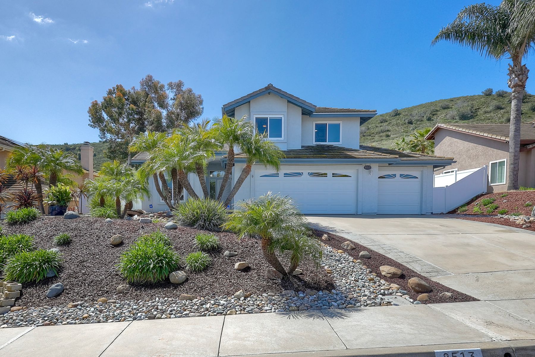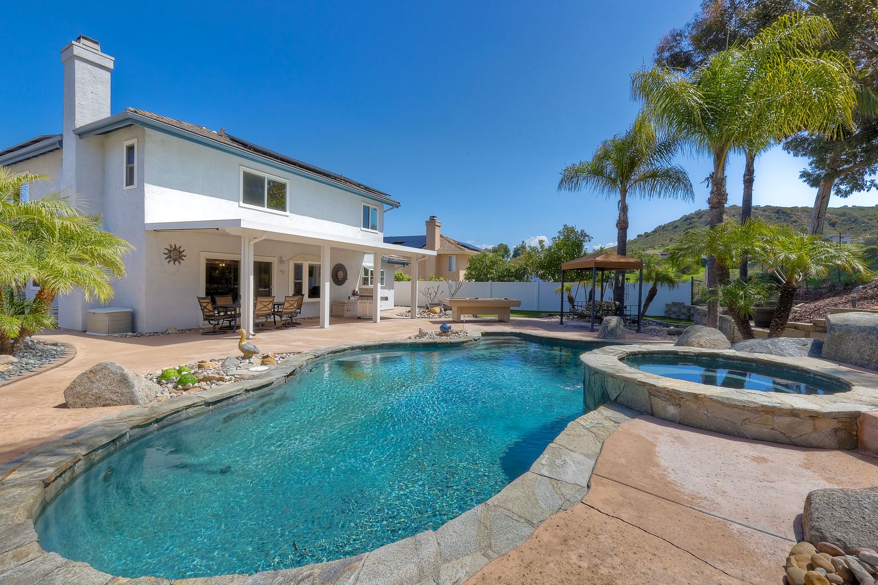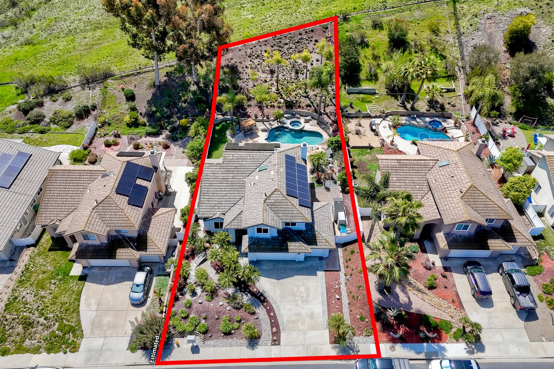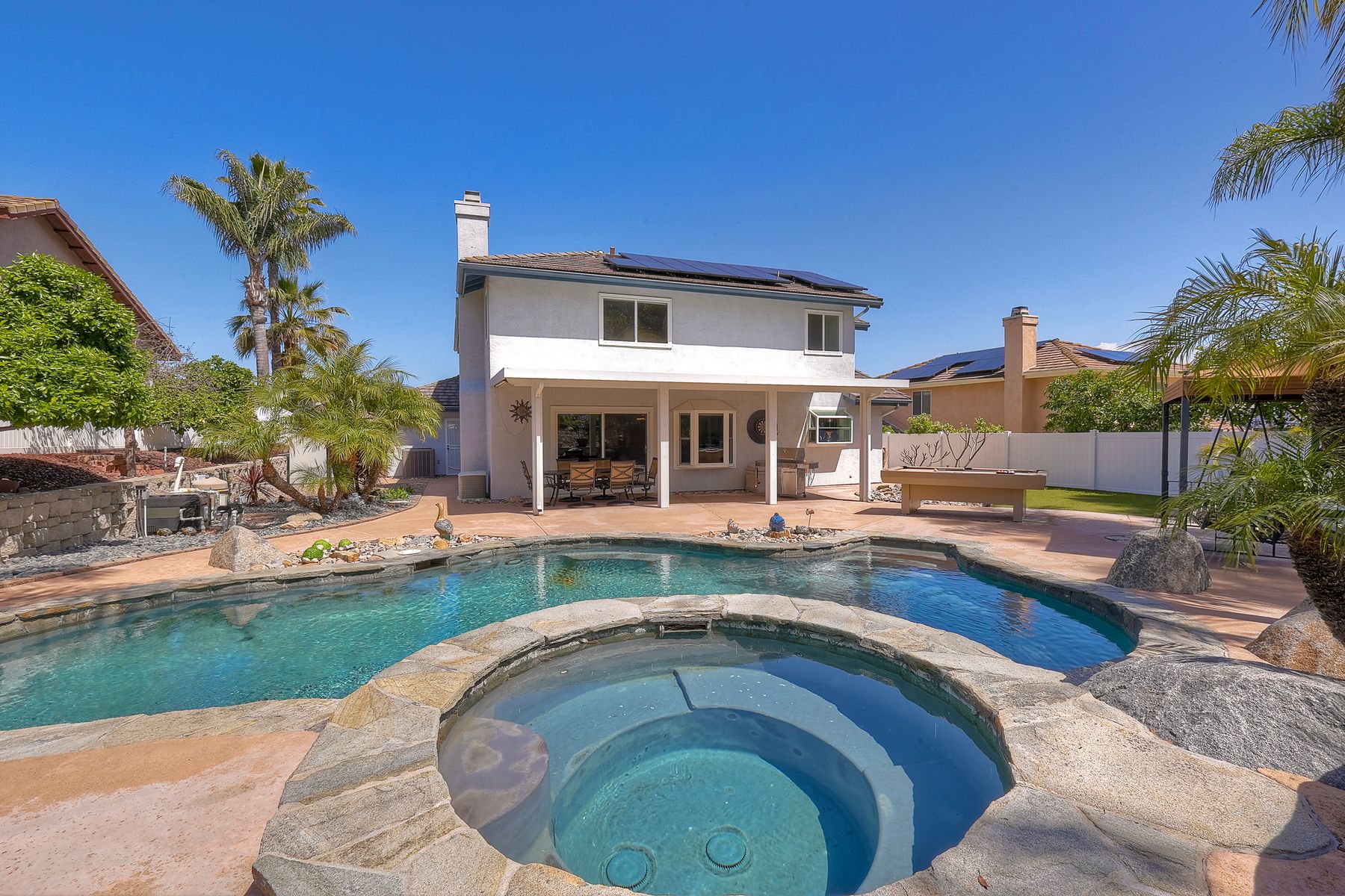 How can it get any better? Beyond turnkey 2,400 SqFt Home on .25 acre meticulously landscaped lot complete with pool/spa, fully owned solar, fruit trees and backing up to Cowles Mountain views!! If you have been seeking a home for your family that provides entertainment opportunities & memories which will last for years ~ you may well have found it! Offering 4 bedrooms (of which one is on entry level), PLUS an office (attached to Primary) and three FULL bathrooms (one on entry level). This open floorplan encourages everyone to share time and space together yet also offers privacy when one needs it. The interior: tastefully upgraded with colors and finishes that are sure to please the most particular of buyers. Kitchen and all three bathrooms have been renovated in neutral tones and impeccable finishes. Cherry laminate flooring - tasteful and easy to care for. The exterior: Designed with FUN in mind - this spacious backyard and pool will make your home the place that everyone wants to be!! ADDITIONAL benefits: FULLY OWNED solar panels. EV charger in the garage. Up-down blinds. Dual pane windows installed 15 years ago. NEW ROOF in 2018. 10-Year New HVAC. House exterior painted within last 5 years. Over-sized 3-car garage w/ ample storage and shelving. This home - situated in the very Southwest corner of Santee puts you close to freeway access, within 30 minutes of the airport, within 30 minutes of the coast, at the base of Cowles Mountain (for the adventurer in you). Just when you may have lost hope that the perfect home existed for you ~ 8513 Mesa Heights is here to restore that hope and waiting for you to start enjoying all the future has to offer!!