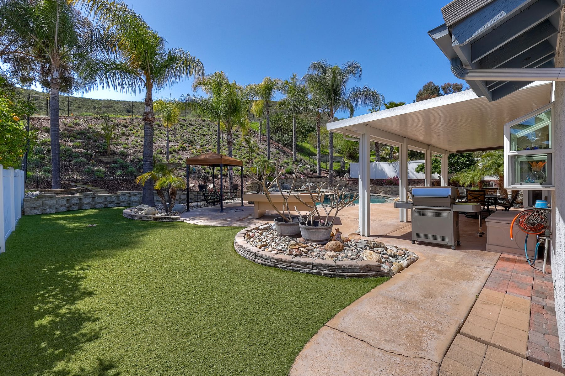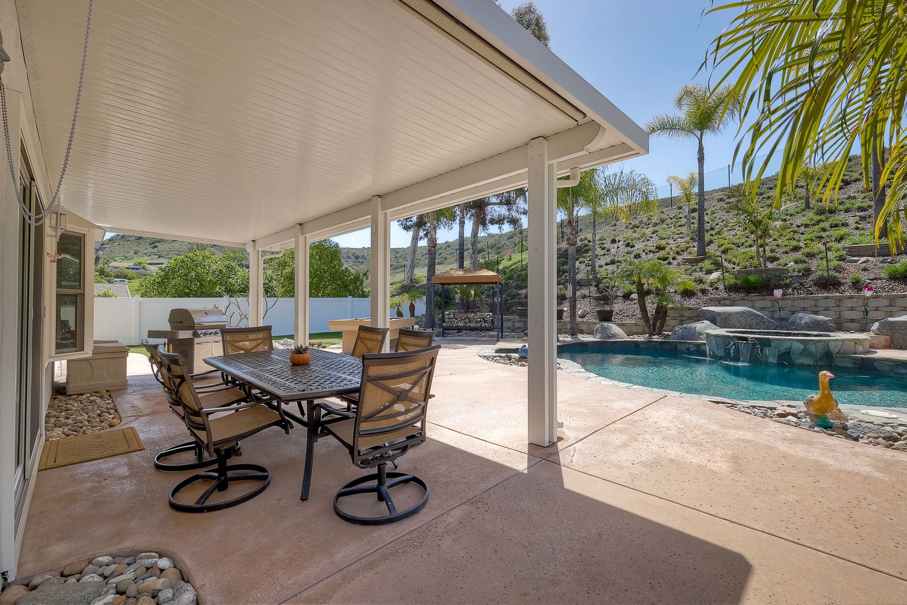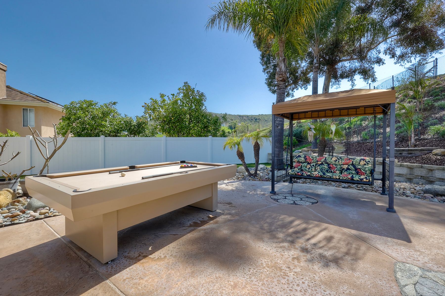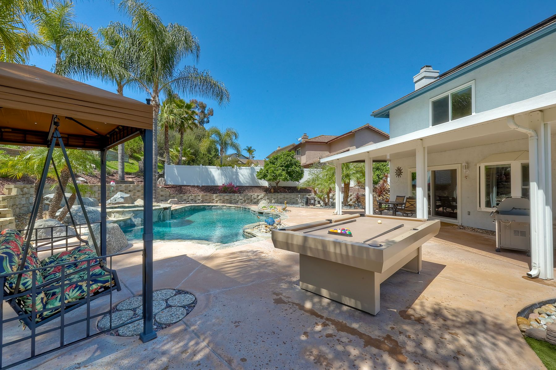 How can it get any better? Beyond turnkey 2,400 SqFt Home on .25 acre meticulously landscaped lot complete with pool/spa, fully owned solar, fruit trees and backing up to Cowles Mountain views!! If you have been seeking a home for your family that provides entertainment opportunities & memories which will last for years ~ you may well have found it! Offering 4 bedrooms (of which one is on entry level), PLUS an office (attached to Primary) and three FULL bathrooms (one on entry level). This open floorplan encourages everyone to share time and space together yet also offers privacy when one needs it. The interior: tastefully upgraded with colors and finishes that are sure to please the most particular of buyers. Kitchen and all three bathrooms have been renovated in neutral tones and impeccable finishes. Cherry laminate flooring - tasteful and easy to care for. The exterior: Designed with FUN in mind - this spacious backyard and pool will make your home the place that everyone wants to be!! ADDITIONAL benefits: FULLY OWNED solar panels. EV charger in the garage. Up-down blinds. Dual pane windows installed 15 years ago. NEW ROOF in 2018. 10-Year New HVAC. House exterior painted within last 5 years. Over-sized 3-car garage w/ ample storage and shelving. This home - situated in the very Southwest corner of Santee puts you close to freeway access, within 30 minutes of the airport, within 30 minutes of the coast, at the base of Cowles Mountain (for the adventurer in you). Just when you may have lost hope that the perfect home existed for you ~ 8513 Mesa Heights is here to restore that hope and waiting for you to start enjoying all the future has to offer!!