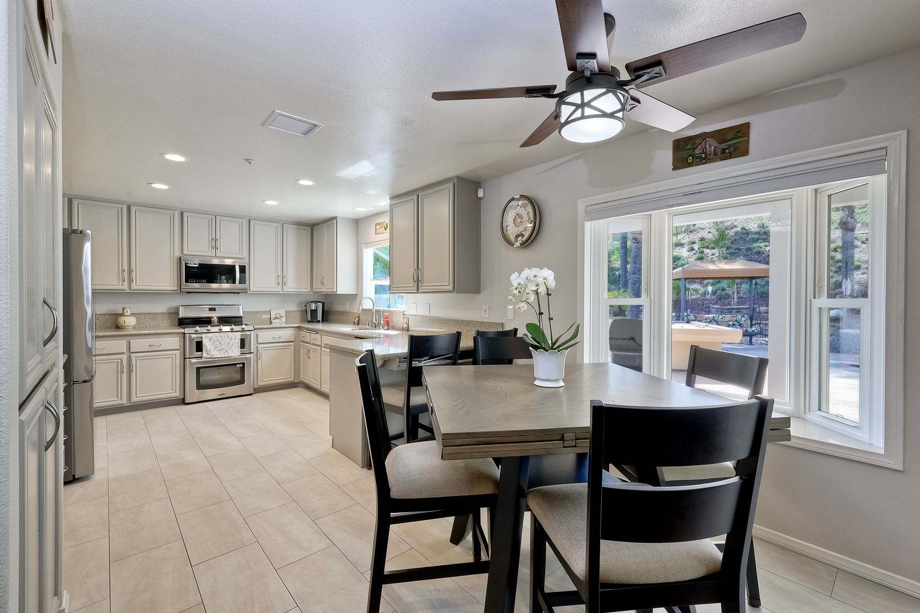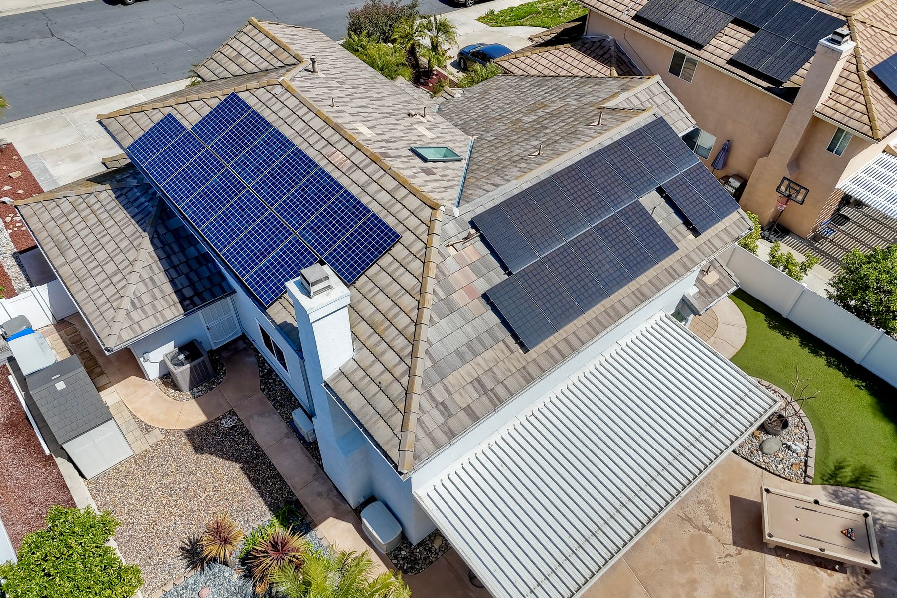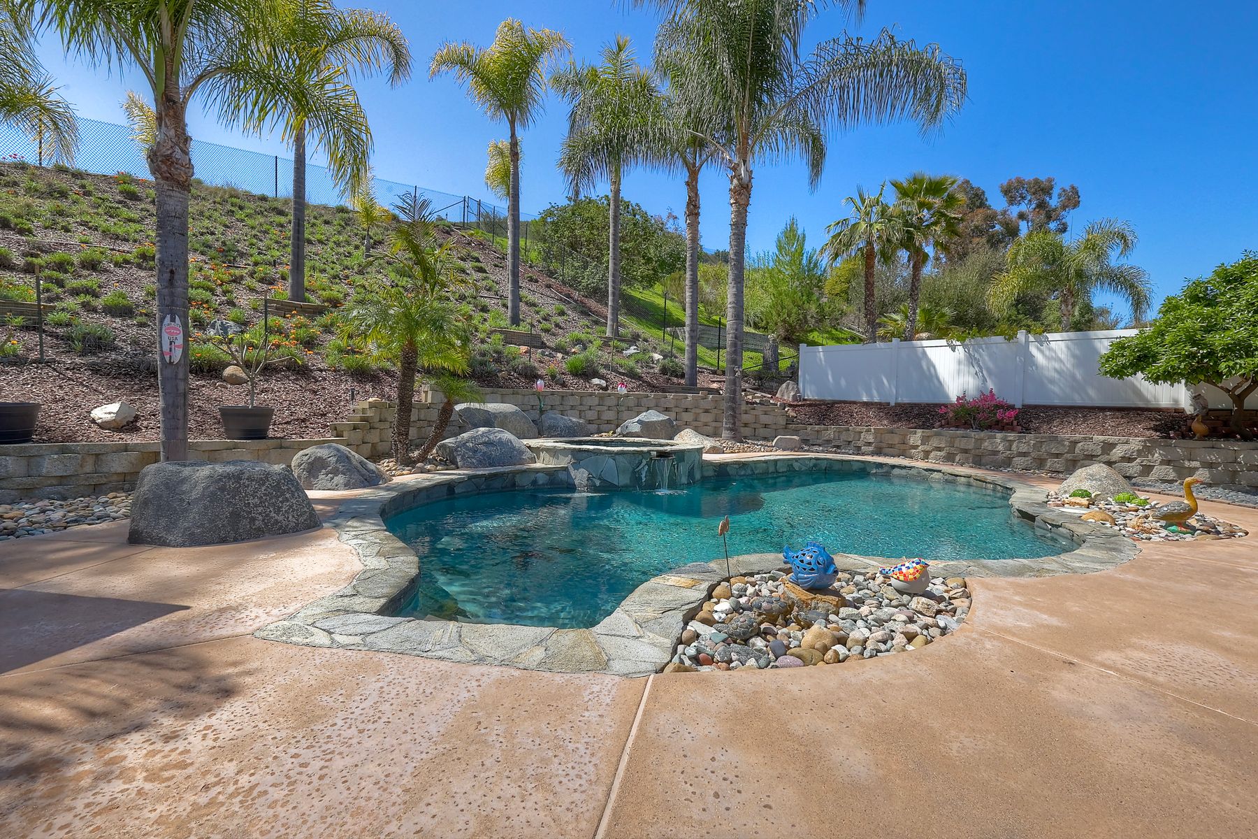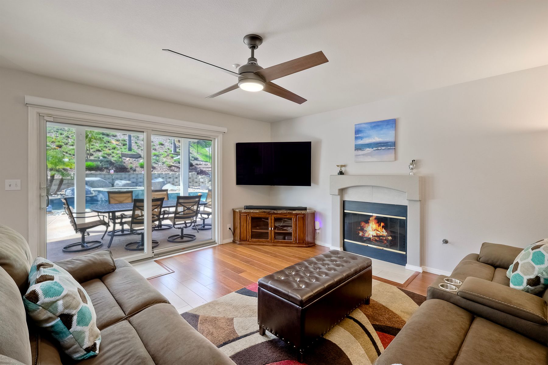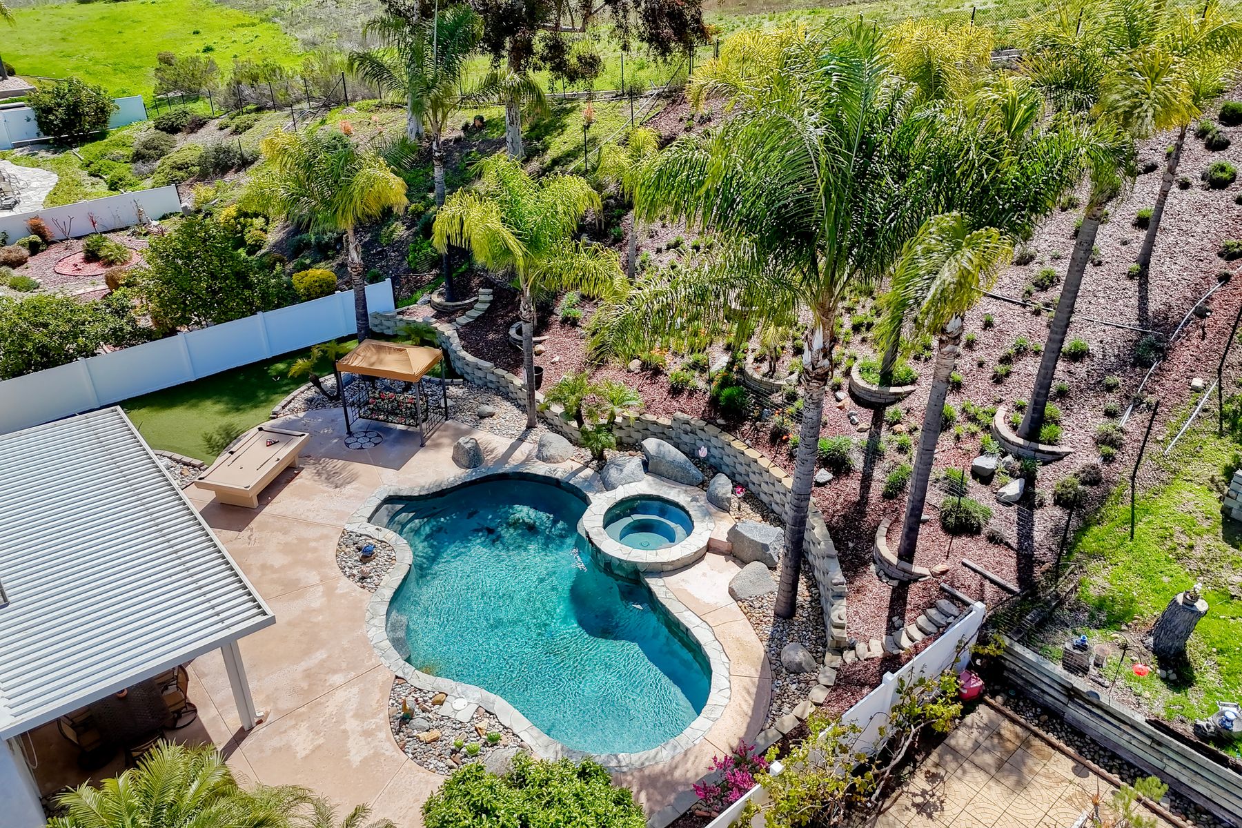 How can it get any better? Beyond turnkey 2,400 SqFt Home on .25 acre meticulously landscaped lot complete with pool/spa, fully owned solar, fruit trees and backing up to Cowles Mountain views!! If you have been seeking a home for your family that provides entertainment opportunities & memories which will last for years ~ you may well have found it! Offering 4 bedrooms (of which one is on entry level), PLUS an office (attached to Primary) and three FULL bathrooms (one on entry level). This open floorplan encourages everyone to share time and space together yet also offers privacy when one needs it. The interior: tastefully upgraded with colors and finishes that are sure to please the most particular of buyers. Kitchen and all three bathrooms have been renovated in neutral tones and impeccable finishes. Cherry laminate flooring - tasteful and easy to care for. The exterior: Designed with FUN in mind - this spacious backyard and pool will make your home the place that everyone wants to be!! ADDITIONAL benefits: FULLY OWNED solar panels. EV charger in the garage. Up-down blinds. Dual pane windows installed 15 years ago. NEW ROOF in 2018. 10-Year New HVAC. House exterior painted within last 5 years. Over-sized 3-car garage w/ ample storage and shelving. This home - situated in the very Southwest corner of Santee puts you close to freeway access, within 30 minutes of the airport, within 30 minutes of the coast, at the base of Cowles Mountain (for the adventurer in you). Just when you may have lost hope that the perfect home existed for you ~ 8513 Mesa Heights is here to restore that hope and waiting for you to start enjoying all the future has to offer!!