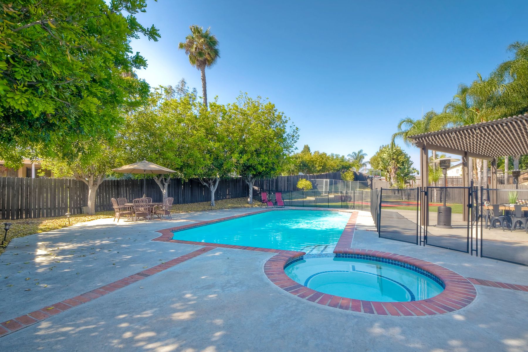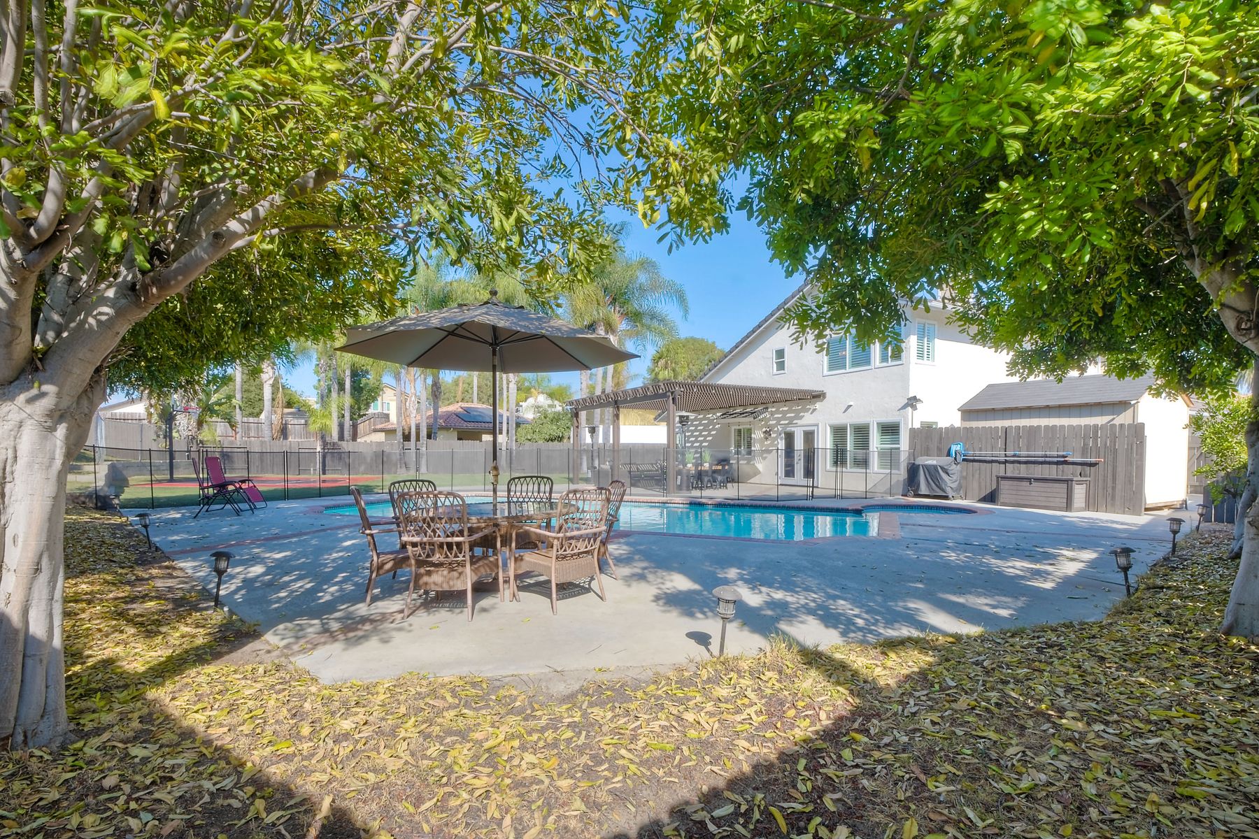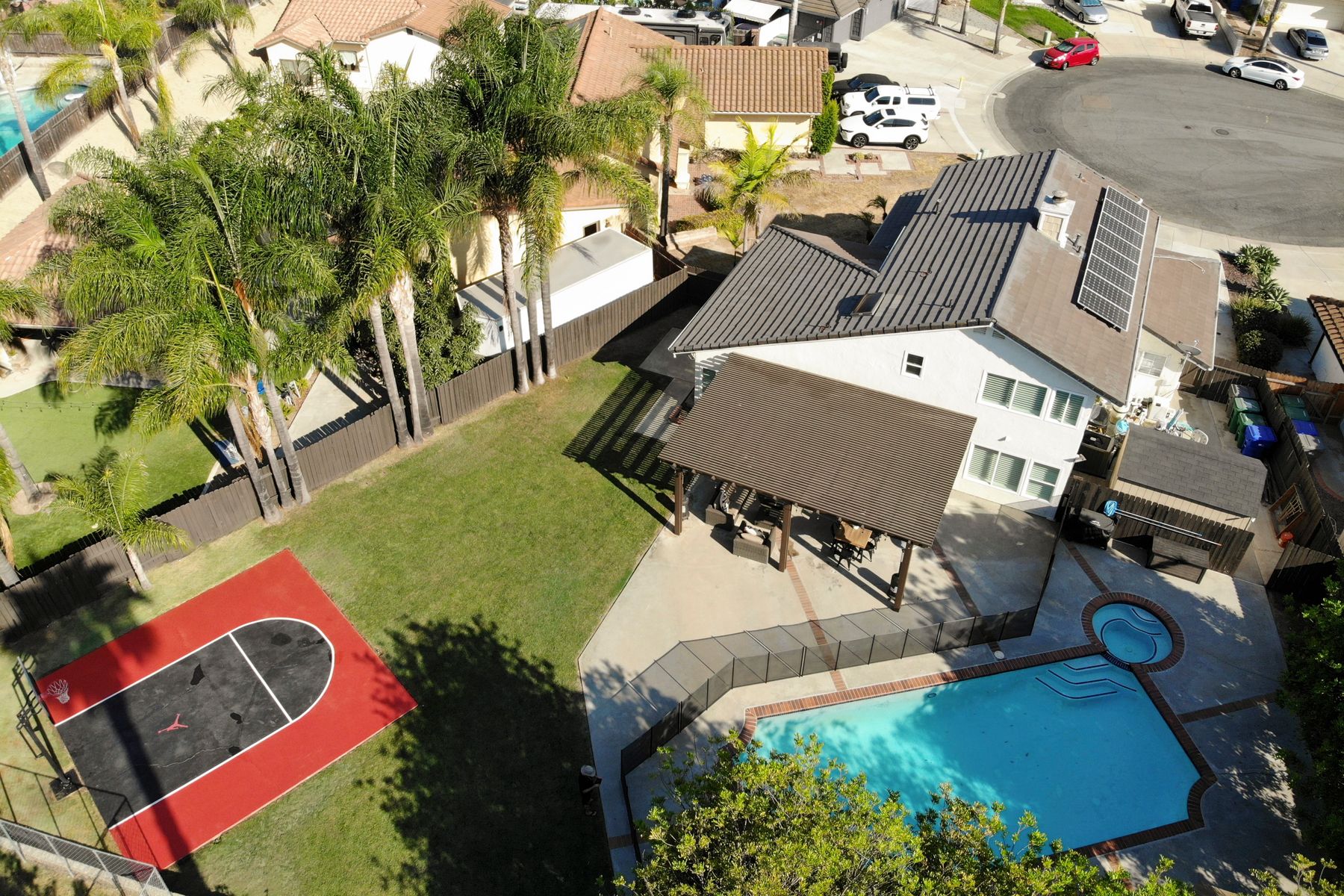 Welcome to your own private oasis encouraging indoor-outdoor living at it's best at the end of a cul-de-sac! Entertainer's dream or simply relax under massive pergola or in the refreshing pool. Versatile backyard basketball/sport court and still plenty of grassy open space to spare. Perfect home for a staycation! Move-in ready as inside you'll find that all 3 bathrooms have been beautifully remodeled, new carpet installed and just painted the best "greige" to accompany any color scheme. Home has paid in full solar, effective central AC, upgraded energy efficient windows with gorgeous plantation shutters for additional efficiency. 3+ cars easily fit in driveway outside your spacious 3 car garage, and since no HOA so allows use of garage as an extended rec room. Large Alamosa Park is just a block away, and 4.5 miles of hiking trails at nearby Guajome Park. Alamosa Park Elementary is close enough to avoid frustration drop off/pick up lines adding time to your busy day. What's not to love? NO HOA & NO Mello Roos!!!