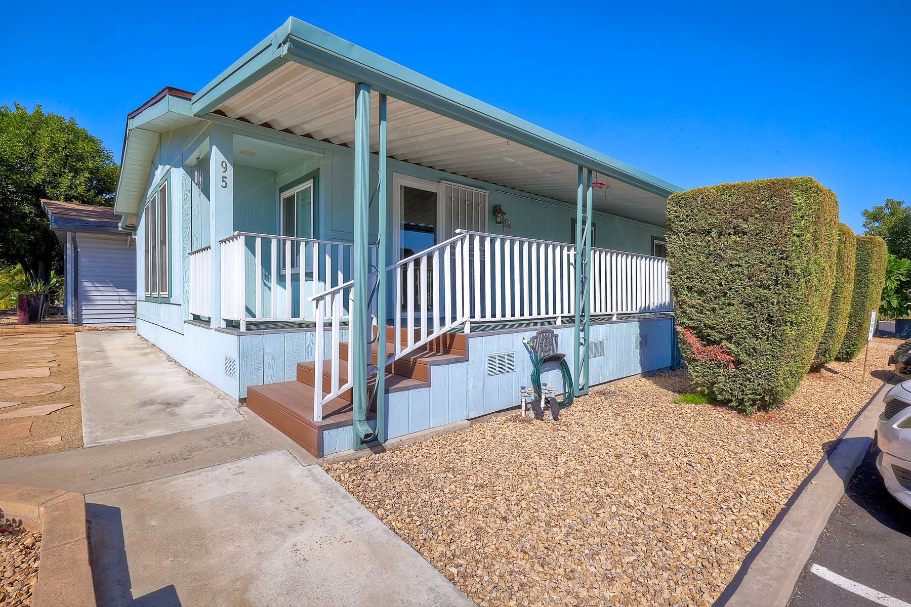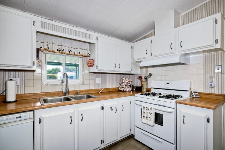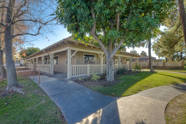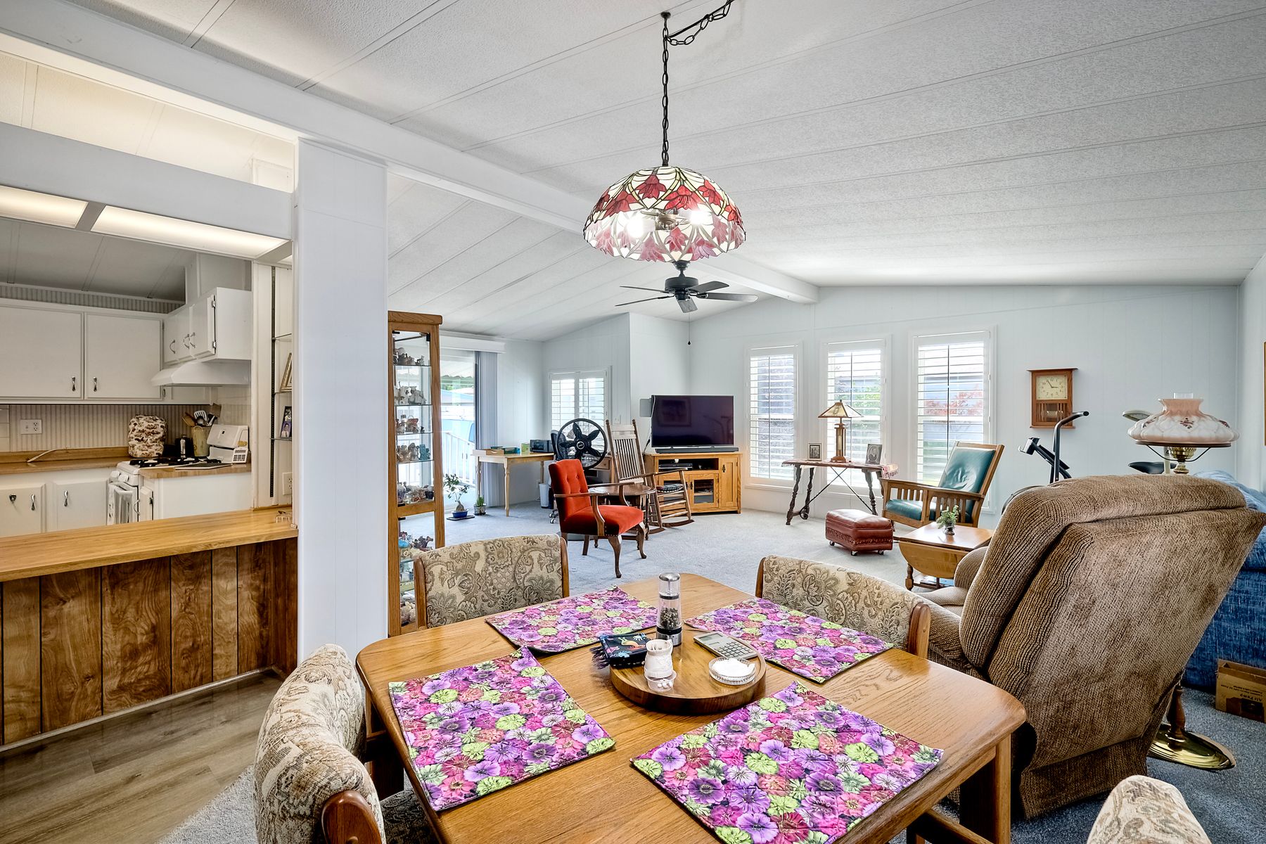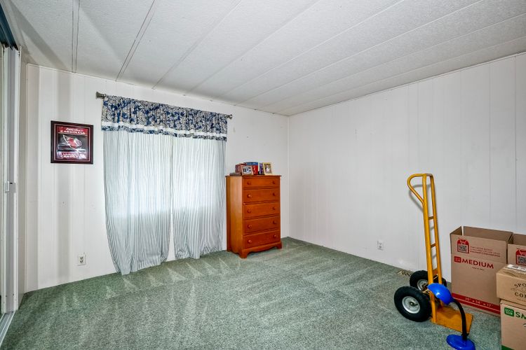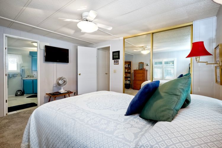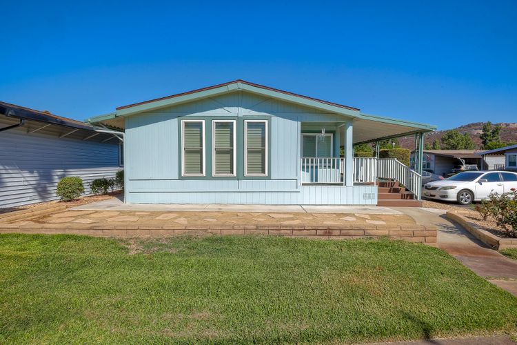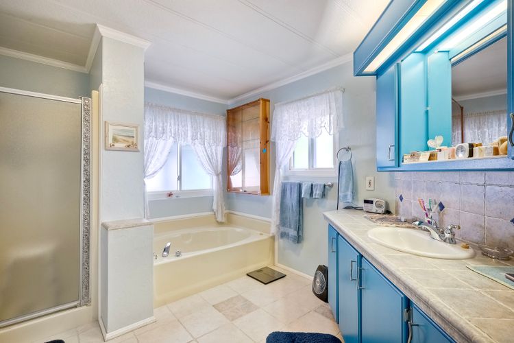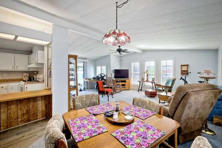 Located in the heart of a serene 55+ gated community, this well-maintained manufactured home offers spacious living and comfort. The open floor plan includes a large eat-in kitchen that seamlessly connects to the dining area and a bright living room with vaulted ceilings and plantation shutters. Dual-pane windows throughout provide energy efficiency and keep the home comfortable year-round. The master suite features a luxurious bath with both a soaking tub and separate shower. A dedicated laundry room offers ample storage. Outside, you'll enjoy a large front porch, 2-car carport with additional guest parking conveniently located nearby, as well as a generously sized storage shed for your extras. For convenience there is a wheelchair lift near the carport. This home combines comfort, functionality, and community living!