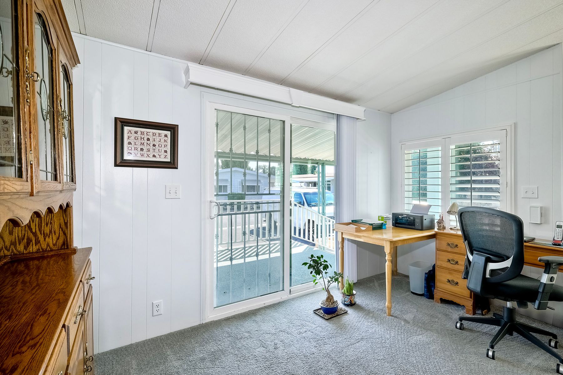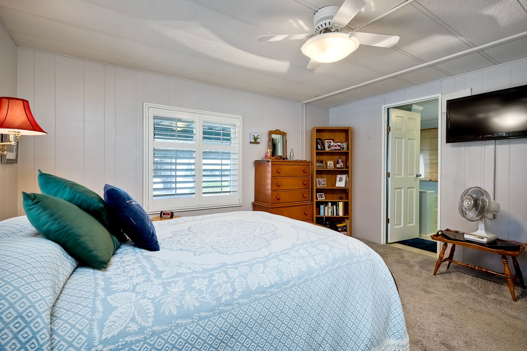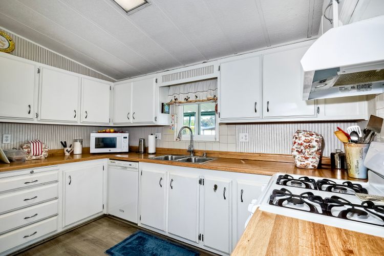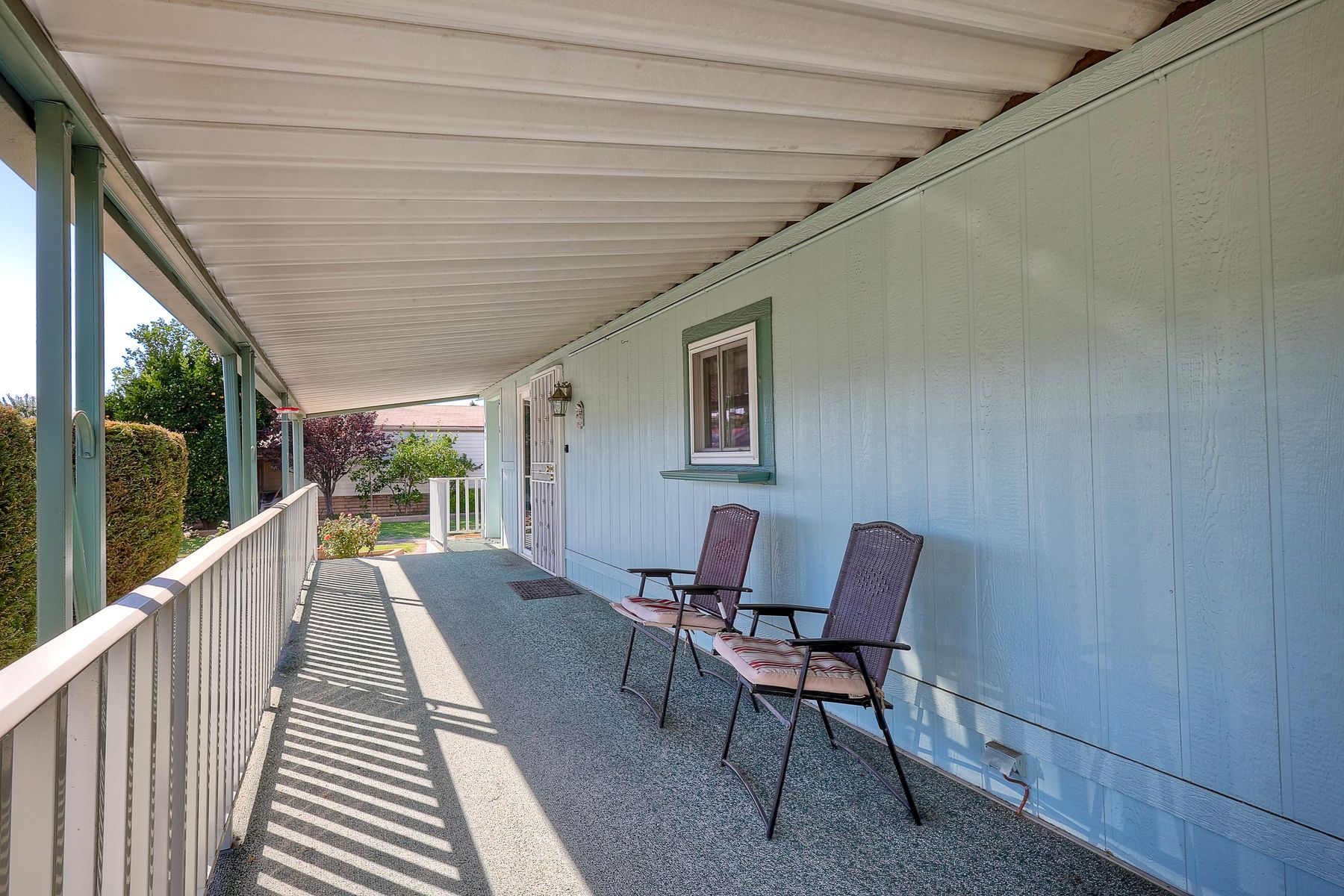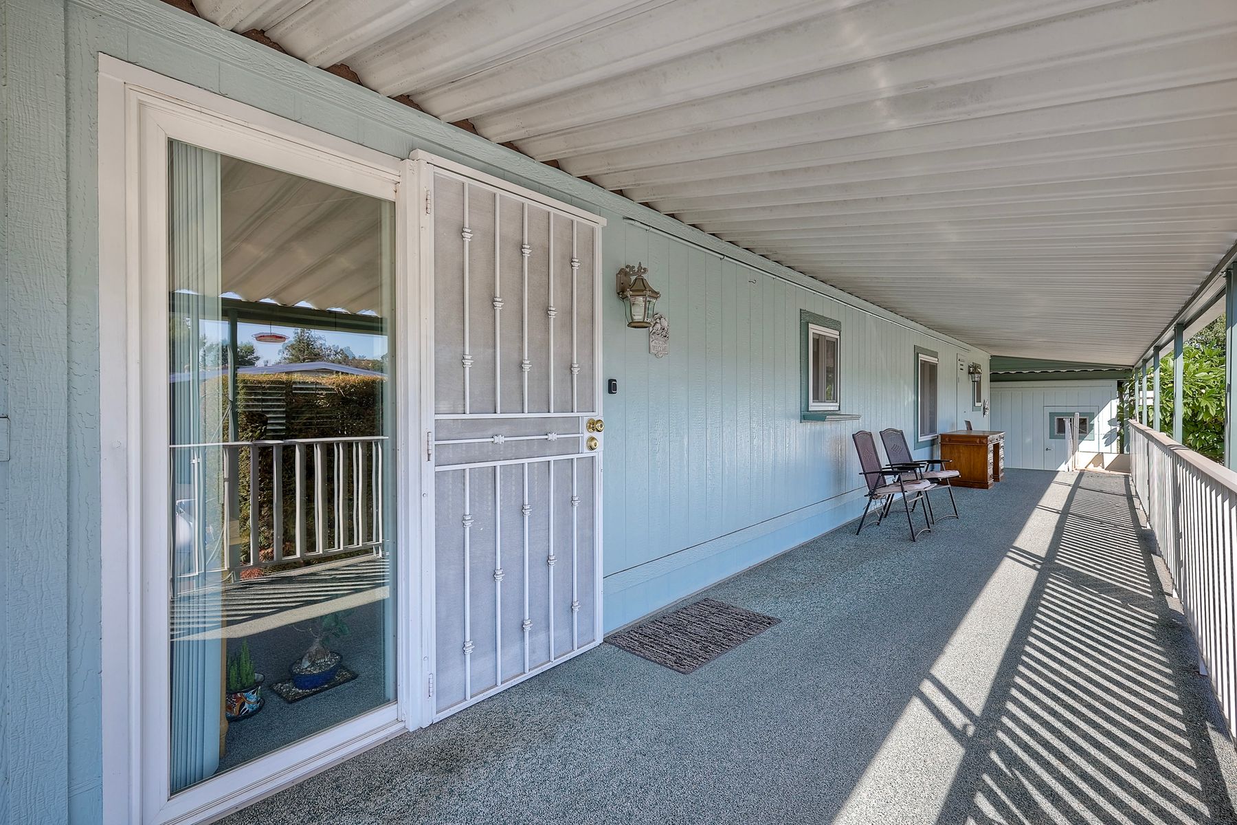 Located in the heart of a serene 55+ gated community, this well-maintained manufactured home offers spacious living and comfort. The open floor plan includes a large eat-in kitchen that seamlessly connects to the dining area and a bright living room with vaulted ceilings and plantation shutters. Dual-pane windows throughout provide energy efficiency and keep the home comfortable year-round. The master suite features a luxurious bath with both a soaking tub and separate shower. A dedicated laundry room offers ample storage. Outside, you'll enjoy a large front porch, 2-car carport with additional guest parking conveniently located nearby, as well as a generously sized storage shed for your extras. For convenience there is a wheelchair lift near the carport. This home combines comfort, functionality, and community living!