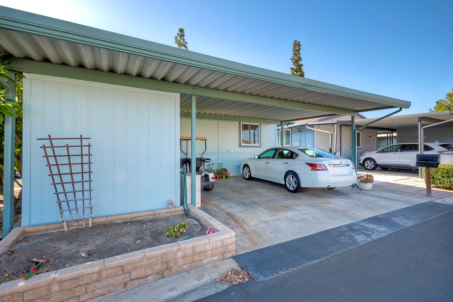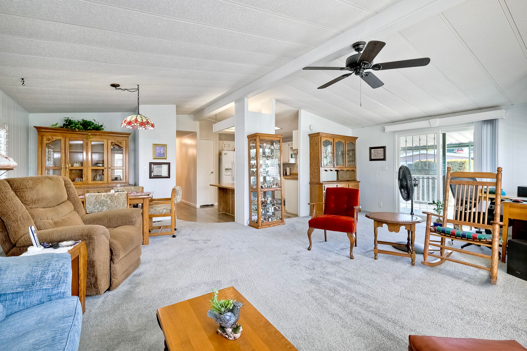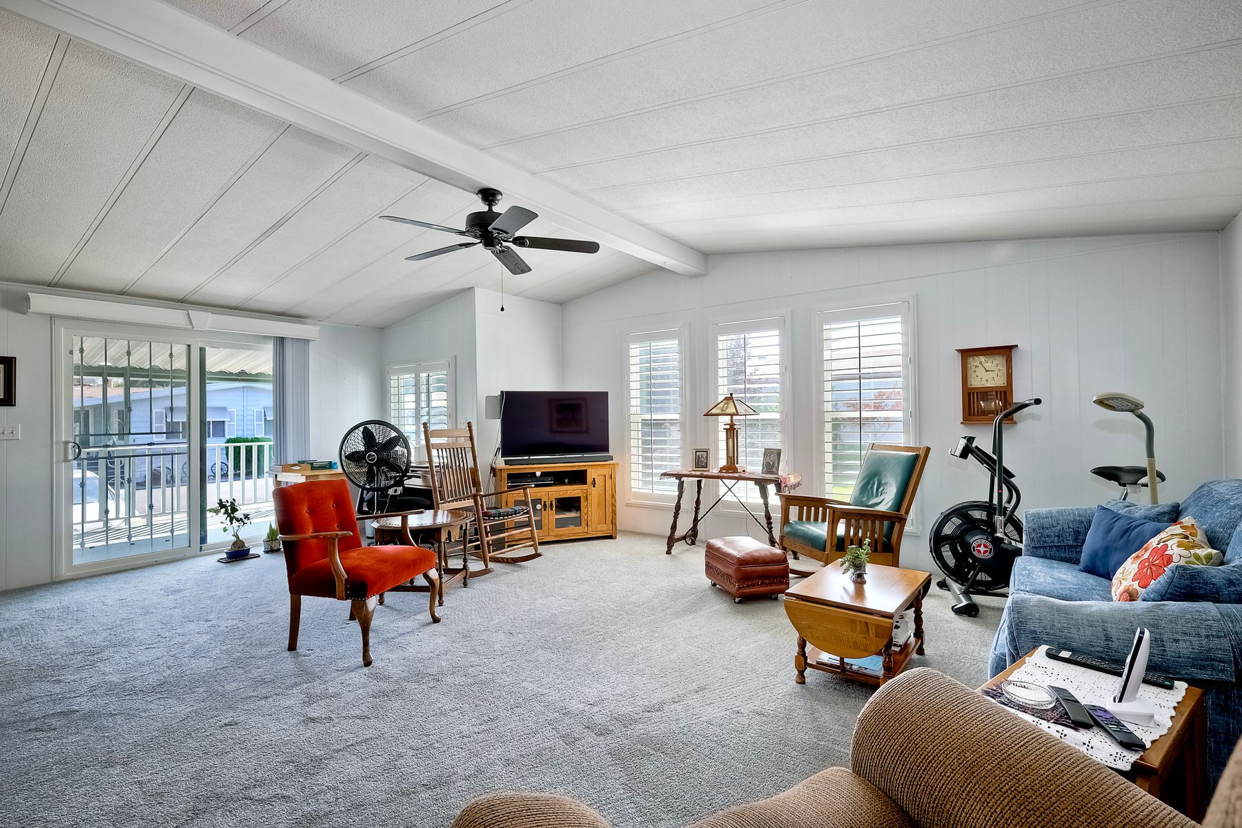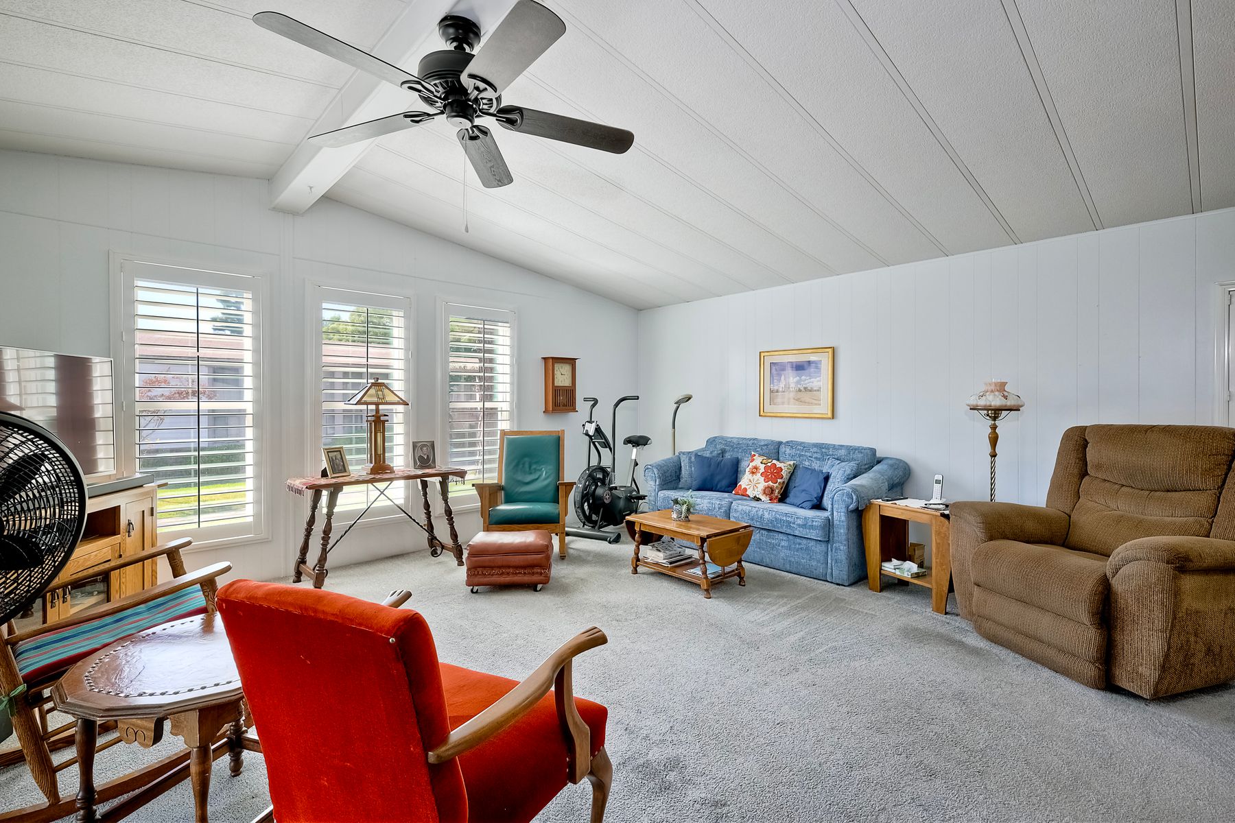 Located in the heart of a serene 55+ gated community, this well-maintained manufactured home offers spacious living and comfort. The open floor plan includes a large eat-in kitchen that seamlessly connects to the dining area and a bright living room with vaulted ceilings and plantation shutters. Dual-pane windows throughout provide energy efficiency and keep the home comfortable year-round. The master suite features a luxurious bath with both a soaking tub and separate shower. A dedicated laundry room offers ample storage. Outside, you'll enjoy a large front porch, 2-car carport with additional guest parking conveniently located nearby, as well as a generously sized storage shed for your extras. For convenience there is a wheelchair lift near the carport. This home combines comfort, functionality, and community living!